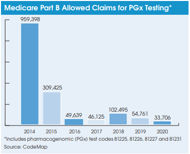 testing (aka cytochrome p450; CPT 81225, 81226, 81227 and 81231) declined from a combined total of 959,398 allowed claims in 2014 to 33,706 allowed claims in 2020, according to data from the coding and reimbursement firm CodeMap (Chicago, IL). Furthermore, CodeMap data show that denial rates for these pharmacogenomic testing codes ranged from an average of 26% (2014) to 85% (2019) over the seven-year period. This compares with average claims denials rates of less than 10% for most routine clinical lab tests.