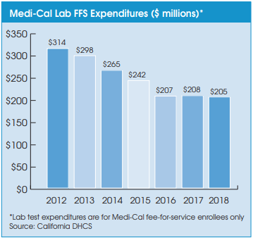 Medi-Cal’s transition to using private-payer lab rates has helped it slash its expenditures on lab testing for its 2.3 million fee-for-service (FFS) members from $265 million in fiscal year 2014 (ended June 30) to $205 million in fiscal year 2018. Medi-Cal lab expenditures have also been tempered by a steady movement toward Medi-Cal managed care plans. Managed care plans are