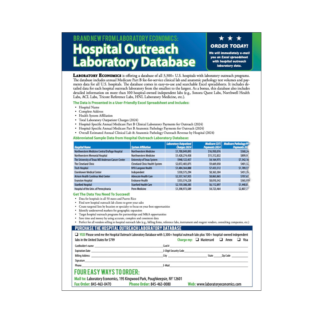 Laboratory Economics is offering a database of all 3,300+ U.S. hospitals with laboratory outreach programs. The database includes annual Medicare Part B fee-for-service clinical lab and anatomic pathology test volumes and payments data for all U.S. hospitals. The database comes in easy-to-use and searchable Excel spreadsheets. It includes detailed data for each hospital outreach laboratory from the smallest to the largest. As a bonus, this database also includes detailed information on more than 100 hospital-owned independent labs (e.g., Sonora Quest Labs, Northwell Health Labs, ACL Labs, Tricore Reference Labs, HNL Laboratory Medicine, etc.).