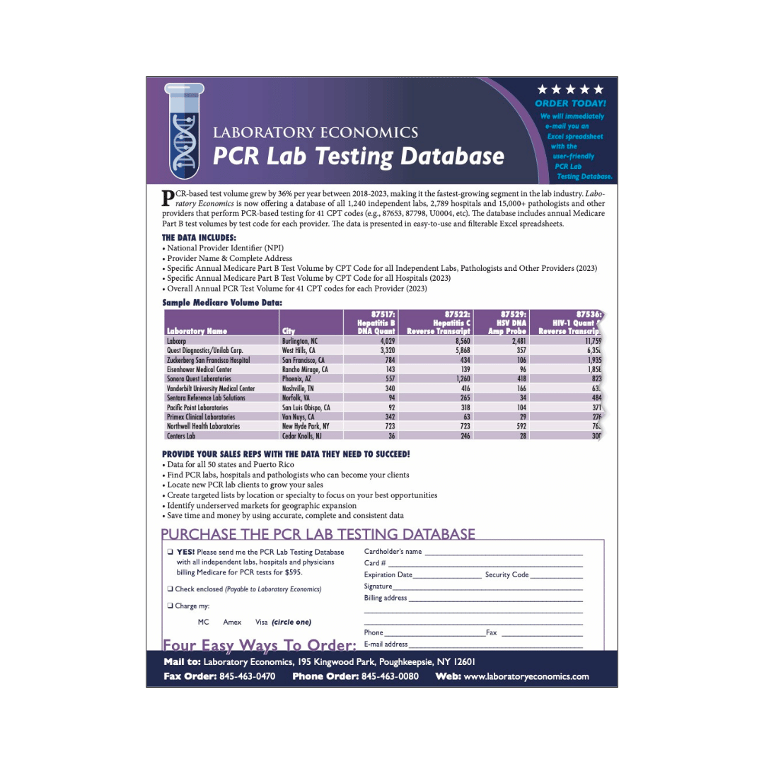 PCR-based test volume grew by 36% per year between 2018-2023, making it the fastest-growing segment in the lab industry. Laboratory Economics is now offering a database of all 1,240 independent labs, 2,789 hospitals and 15,000+ pathologists and other providers that perform PCR-based testing for 41 CPT codes (e.g., 87653, 87798, U0004, etc). The database includes annual Medicare Part B test volumes by test code for each provider. The data is presented in easy-to-use and filterable Excel spreadsheets.