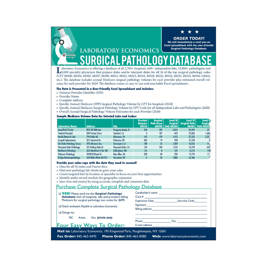 Laboratory Economics is offering a database of all 2,700+ hospitals, 600+ independent labs, 13,000+ pathologists and 5,000 specialty physicians that prepare slides and/or interpret slides for all 16 of the top surgical pathology codes (CPT 88300, 88304, 88305, 88307, 88309, 88311, 88321, 88323, 88325, 88329, 88331, 88332, 88333, 88334, 88356, G0416, etc.). The database includes annual Medicare surgical pathology volumes for each provider plus estimated overall volumes for each provider for 2023. The database comes in easy-to-use and searchable Excel spreadsheets.
